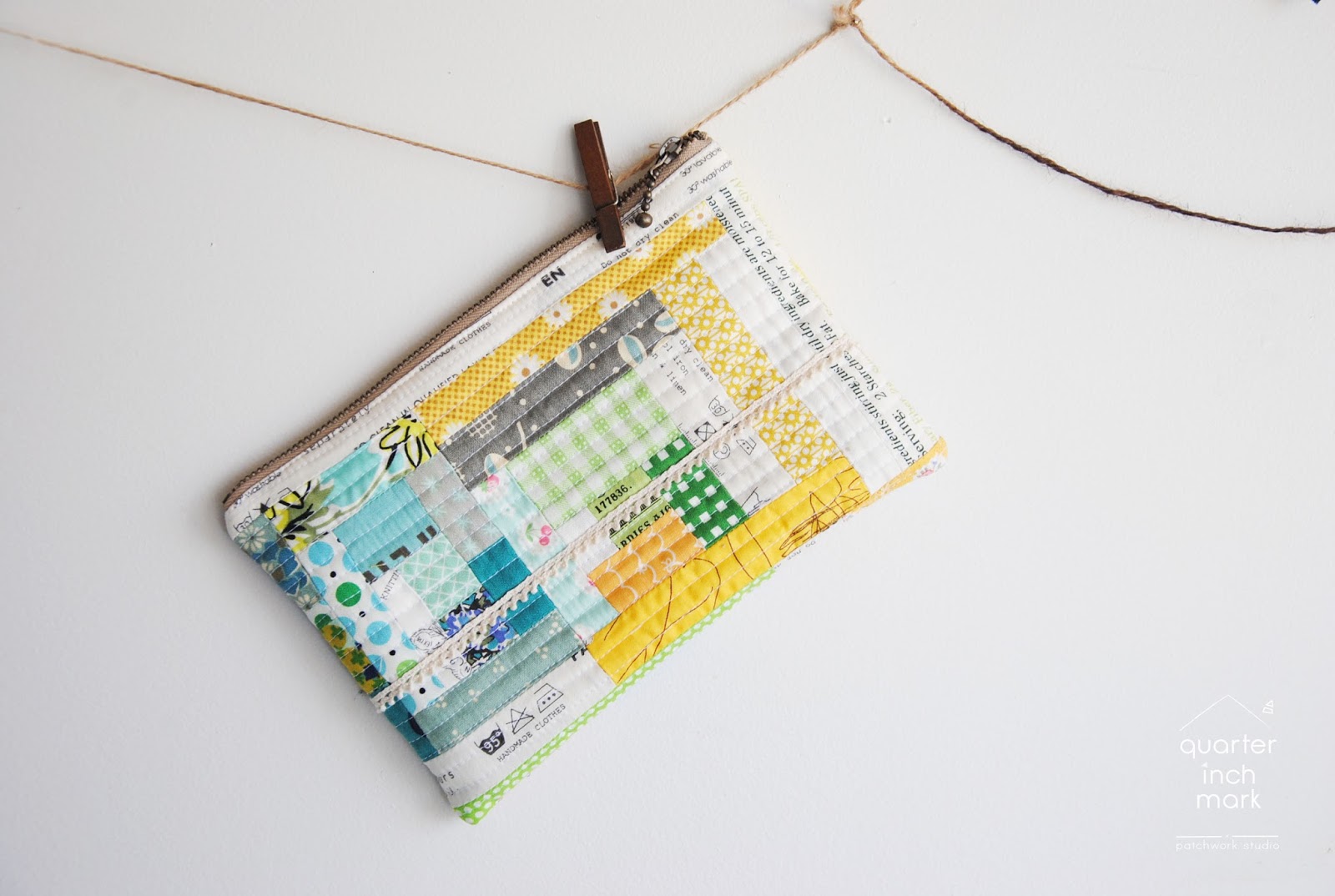 Blues, yellows, and whites are three of most useage colors around quarter inch mark. Wonderland kin-cha-ku has purposely using the linear prints on the white print, so it leads the other prints stand out! This kin-cha-ku, is hand-quilted throughout the front and back.The string is used 100% linen wax.