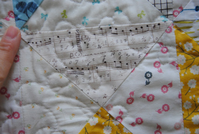 The backing print is used a large music sheet print ( 2 yards) that I've had for years and pieced with the remaining fabrics from the quilt top then added few other prints that would go well with it. I tried not to worry about the backing so much for this quilt. The randomness is just a nice call for it. Using fabrics that I have instead of acquire more for the backing is a big saving.