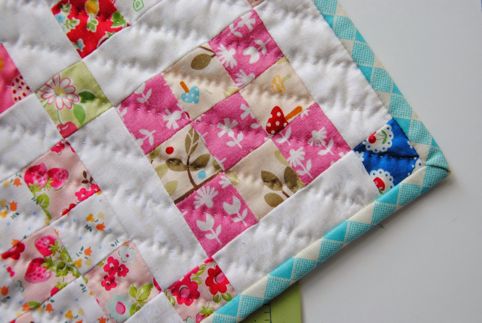 This berry mini quilt has been shipped this morning and hope it will arrive to the receiver's mail box soon! It truly turns out to be a lovely mini quilt. I intended to used berry prints and mixed with contrast value prints for this mini quilt. Each squares are cut in 1.5"x1.5", so it finished at 3.5"x3.5" for each nine-patch block. For the stashing fabric, I chose {Holly Holderman's Recipe for success white on white}. I love how it shows when the sun comes in the room.