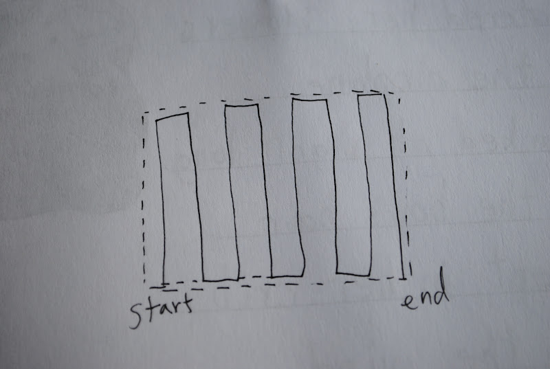 Here is a hand drawn diagram. Pretend the dashing lines are the fabric piece and the straight line is the quilting line. I sew very close to the edge of the fabric piece.