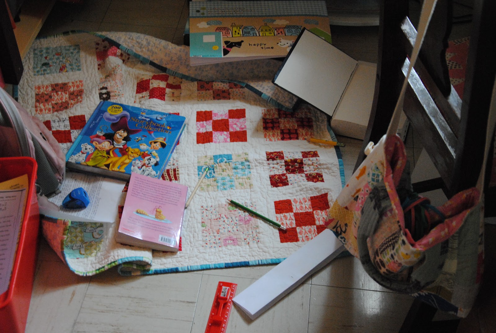 While I was busy with the review, S set up a little writing center on her side of table. She has been writing stories and looking up words in dictionary as she found it is a better research resources. As you can picture..our home is looking pretty similar like her spot, clutter.