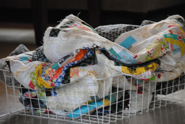 {Log cabin quilt} is almost done... The hoop is out since it limited the quilting area as I was working. I got the huge {wire basket} from IKEA and need more. They are perfect for storing