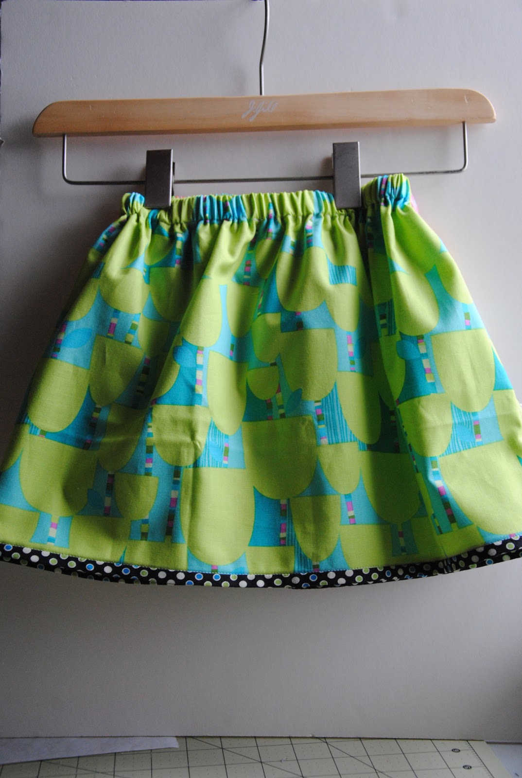 After the green spring skirt was hung in the room. S asked if she can have one, but she would like the top trim with darker fabric. With those requests I can't say no! It used to take 1/4 of fabric to make one skirt for S, but this time was 1/2 yard of fabric. It is the time that I feel a little sad that she is not a baby girl anymore. She is a young lady!