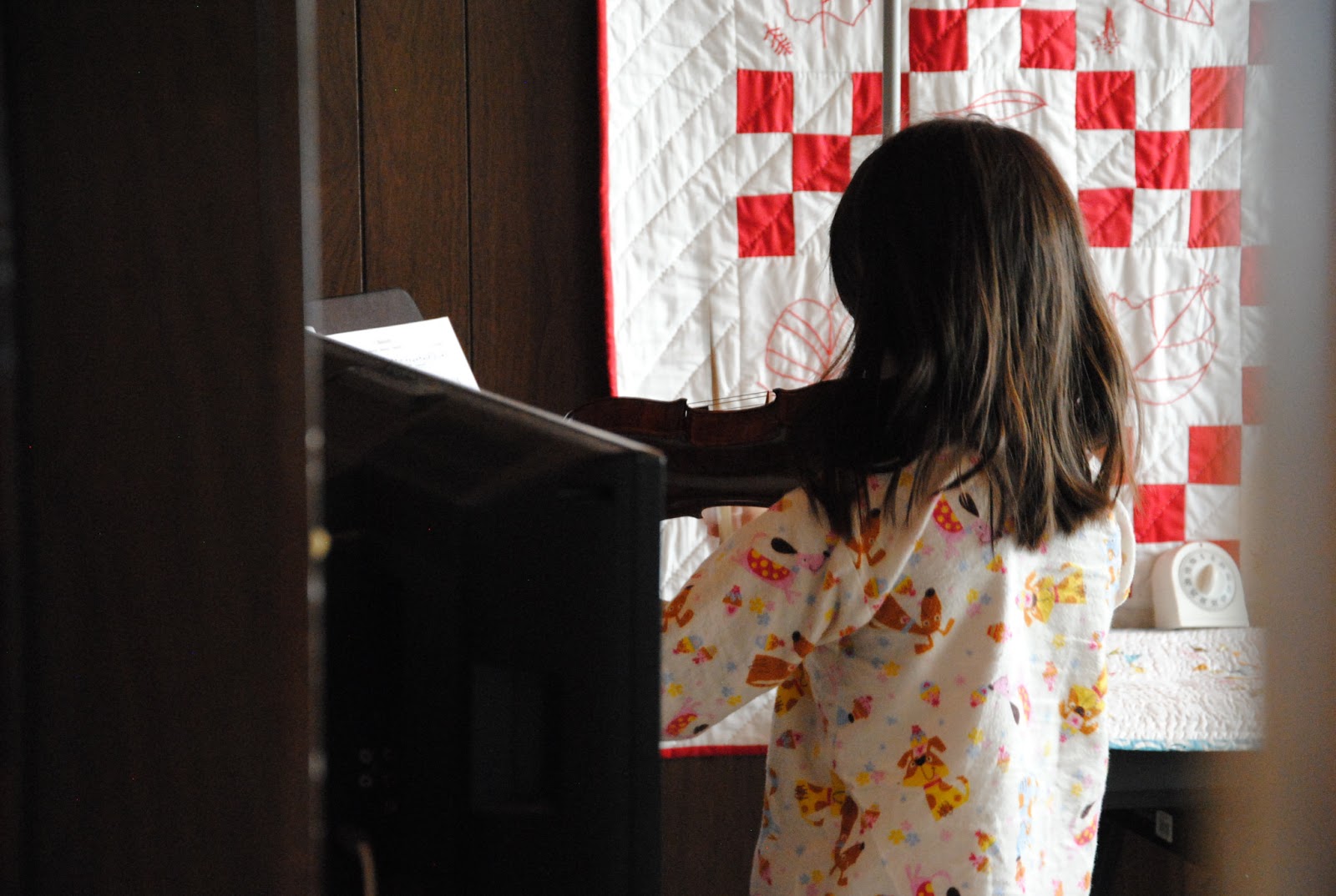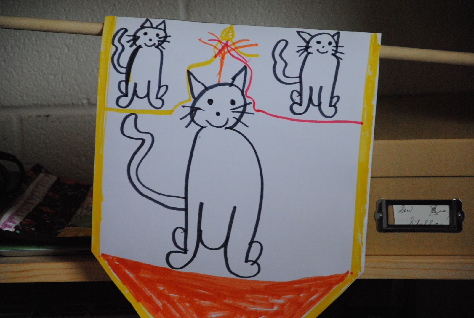 We both keep our pajamas on for the day. It feels really good and comfortable! It is the kind of Sunday that we both are feel being home and make it a casual day together. S is back in making mode this morning. She made a banner, one side is pups and another side is kitties. It is up in her space at the moment.