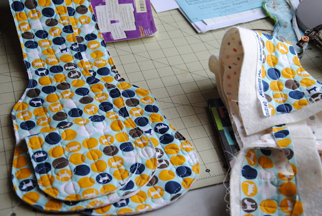 I spend long hours in the fabric store and tried to find the {right} fabric on Tuesday! Nothing floral, not too girly, not too boyish, not too pink, not too much colors, not too much shapes on the print...When I saw this blue and yellow polka dot with pup and kitty in them. I knew it would be a perfect print for S. Then since the blue and yellow might be considered a little boyish I went ahead and look for a softer print for the lining. The random polka dot print was a perfect match for it.