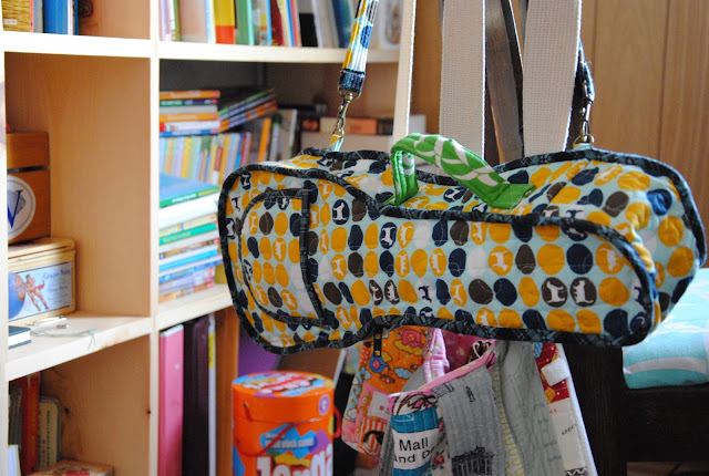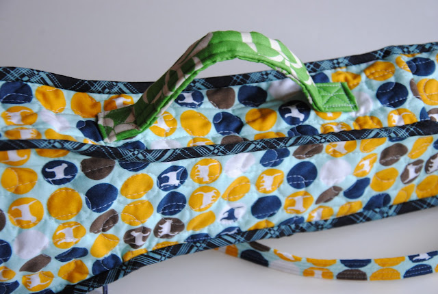 The binding is used bias tape binding, which allows to stretch a little more around the curves. After attached the bias binding, I went with hand-stitch to finish the binding, so it makes the bag a cleaner look.  Insert zipper was the most fun part on this project. I never sewn a zipper so thick and wide before and it really make the bag super sturdy look.   S picked out the handle print- Katie Jump Rope by Denyse Schmidt and it is just the right green to highlight the blue and yellow.