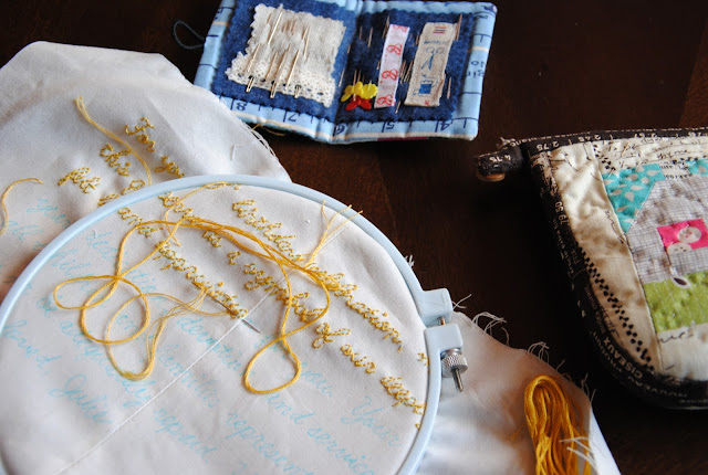 Today, I made my mind to stay home and work on Julie's signature quilt. Somehow I considered that's my rest and break. I could finally enjoy the speed of the machine and enjoy movie and sewing again. The quilt has been basted and started quilting this morning before I headed to S' school for lunch and her presentation. Now, I am sitting in the kitchen writing this post and waiting the kettle to whistle. A good cup of tea is needed to ease the tense of the nerve bugs.