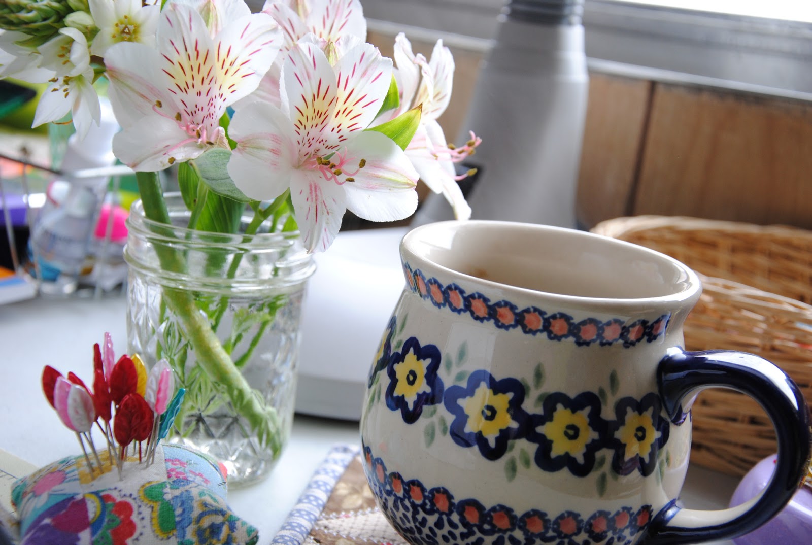 I have taking so much photos lately with the lovely flowers. I am so inspired by my friend { M}. I love her photos and of course her {quilts}. I wish to visit her someday and play with her {pup}. This morning, Tulips were most ready to say goodbye. S saved some of the flower petals and there are a few still living. A little celebration of spring, so a little flower arrangement seems appropriate by the sewing machine.