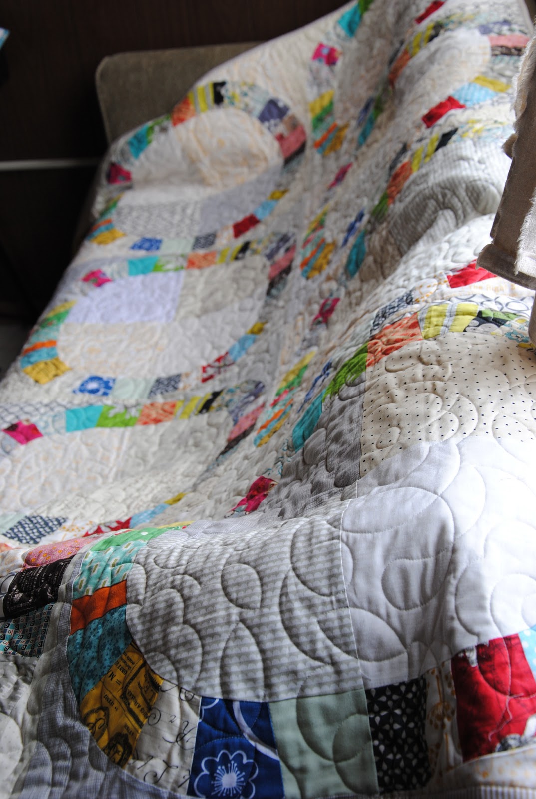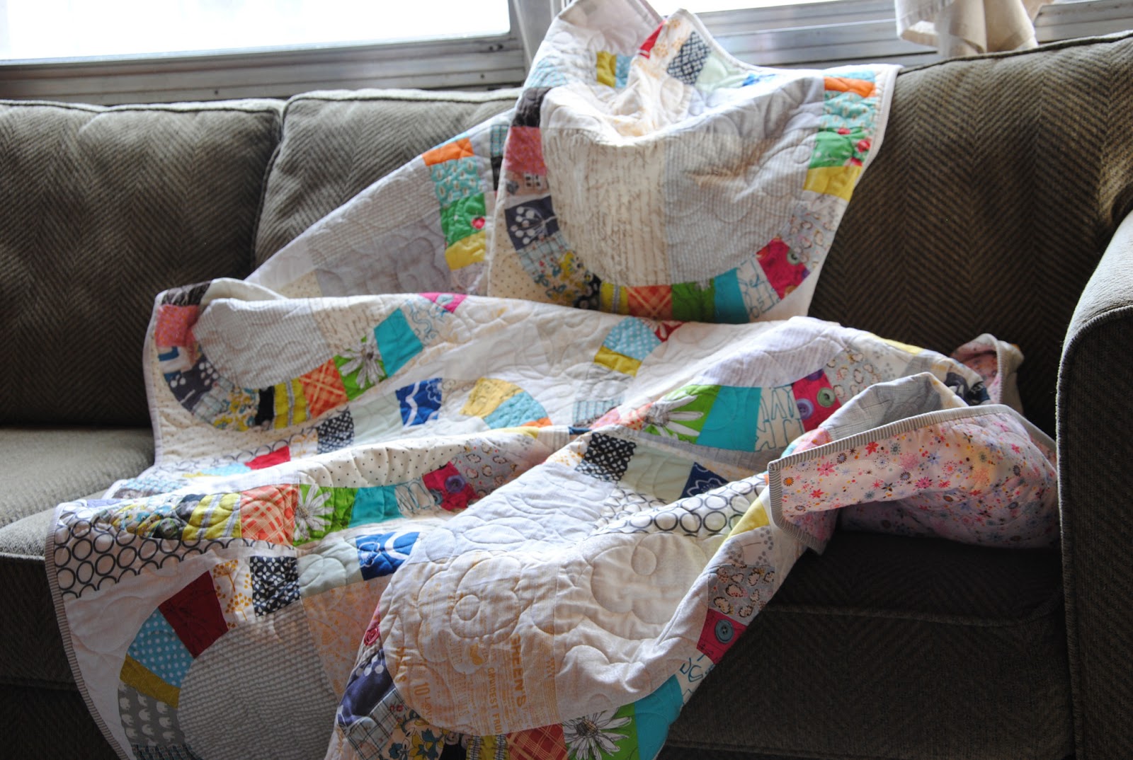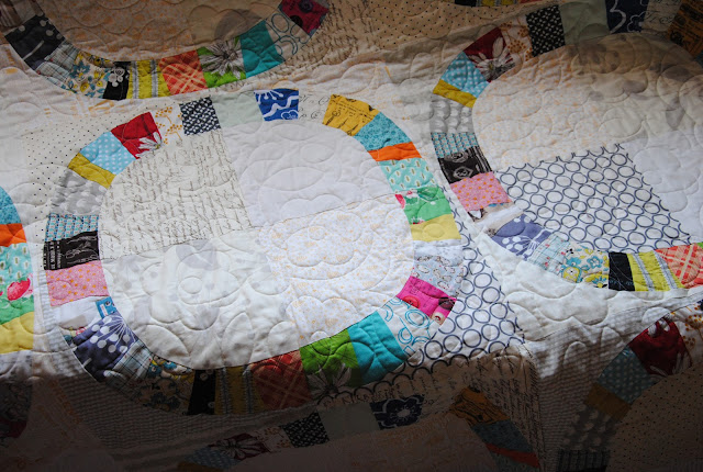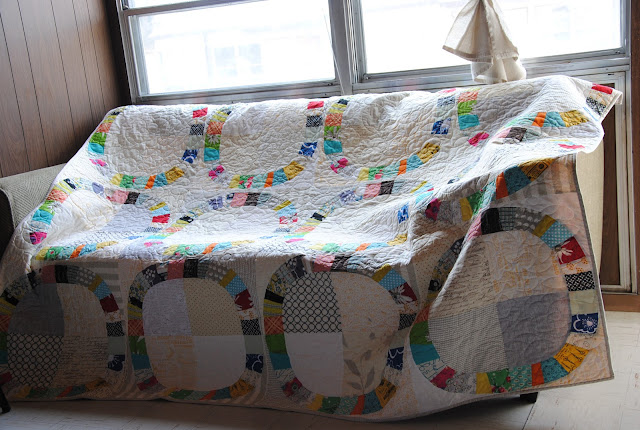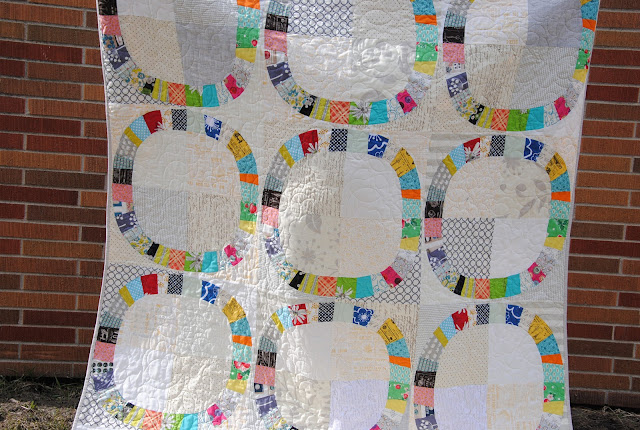 6. what a beautiful post about your 'roomie quilt' Chase, thank you so much for sharing your words and thoughts. Your quilt is so beautiful. I love that you've used lots of different neutral fabrics in the background - they create so much movement behind the gorgeous rings. Happy packing and moving and settling into your new home. Cat.