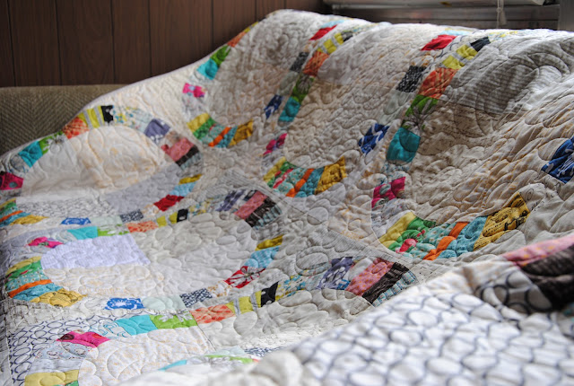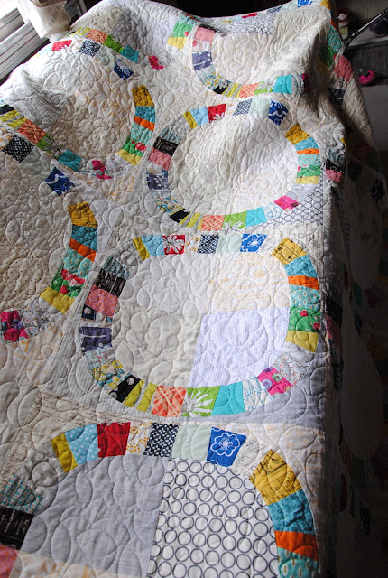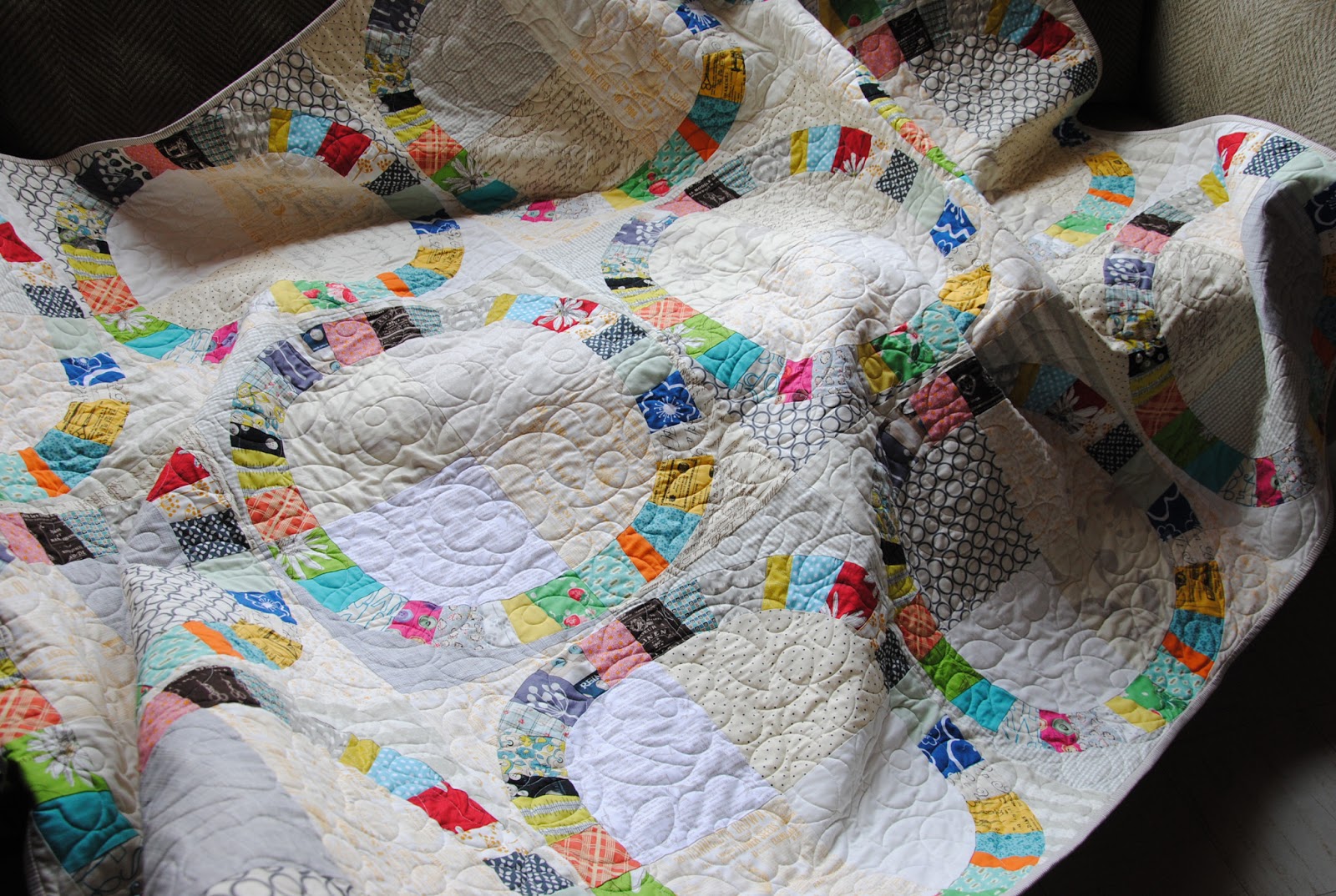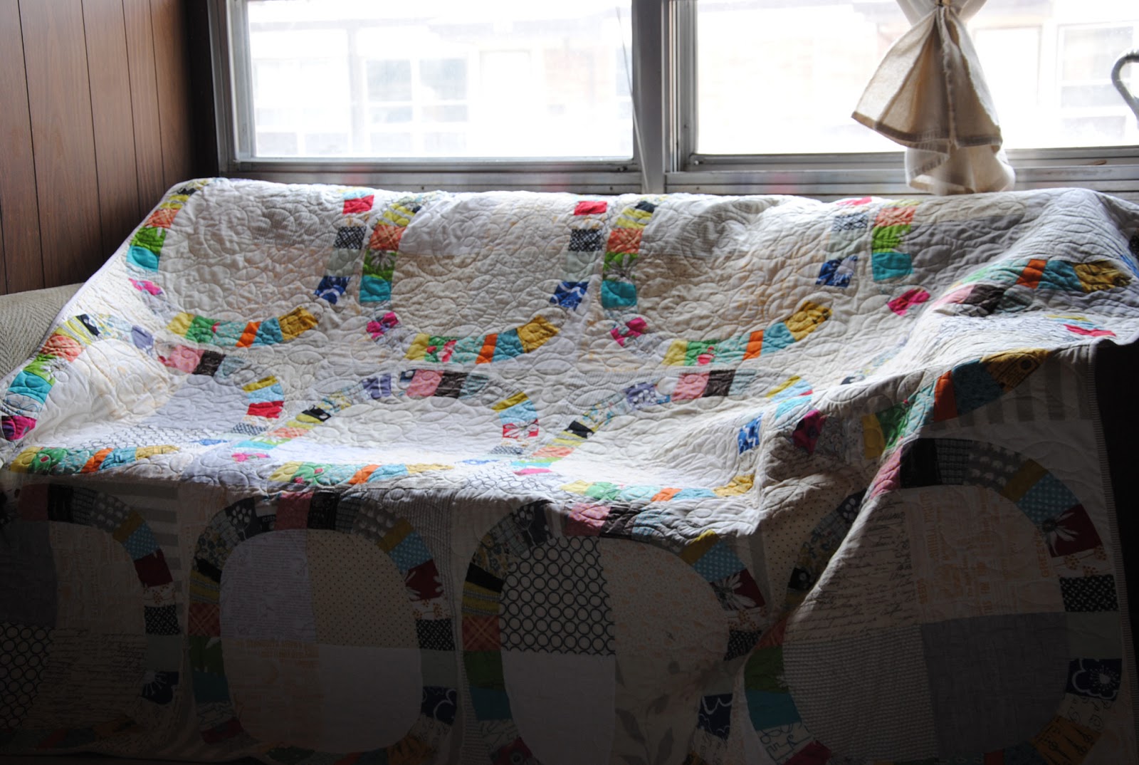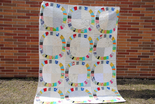 6. what a beautiful post about your 'roomie quilt' Chase, thank you so much for sharing your words and thoughts. Your quilt is so beautiful. I love that you've used lots of different neutral fabrics in the background - they create so much movement behind the gorgeous rings. Happy packing and moving and settling into your new home. Cat.