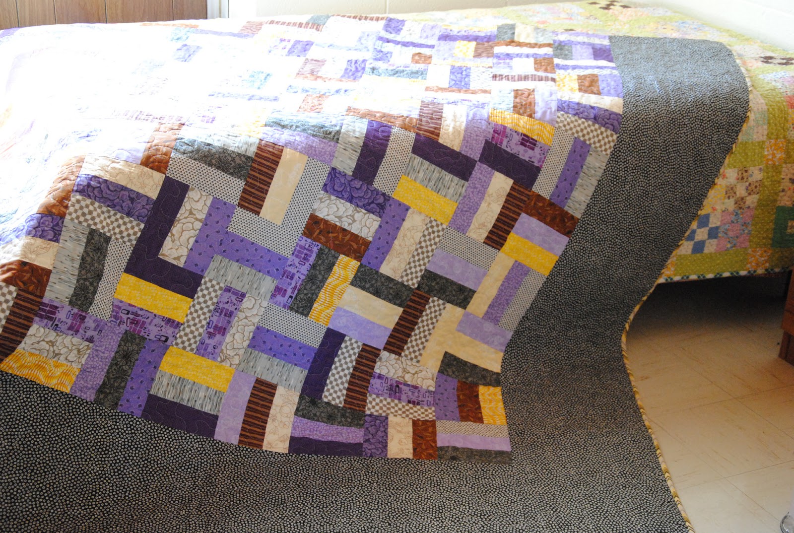 Peter was so busy even though he was here! Stella secretly put his quilt in their bed for him, but he didn't even notice on the quilt in the bed and there was a note that S wrote {sleep well.}. Peter had no idea that quilt is for him! Two Stellas { Stella, the pup and Stella, the girl} went in the room and got the quilt out. We began to sing the birthday song. Oh, Peter was shocked and kept asking ..the quilt is for me? for me? How did you have time to do this quilt for me? Of course, there's always time for making quilt to dearest friends. It is no my usual color; purple, brown, yellow, and gray. There were many questions that I had ...what if he is not liking the colors and maybe it is wrong purple? Julie and I have had so many emails on the process of making Peter's quilt. Yes! he loves his quilt!! They both used their quilt while they were here!