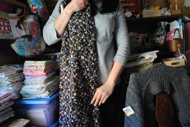 So, the new Tova fabric arrived! Do you think it is too dark? It is light cotton wight with nice dotty texture on. I love it! Really love it!! I used to wear a lot black tops, but I try not to dress in black for many years now. My mom is a totally dress in black lady. That's why most of my clothes were black back then. It is the same print I used for the single girl. Hope S thinks it is a cool fabric and would love to have a matchy top together.