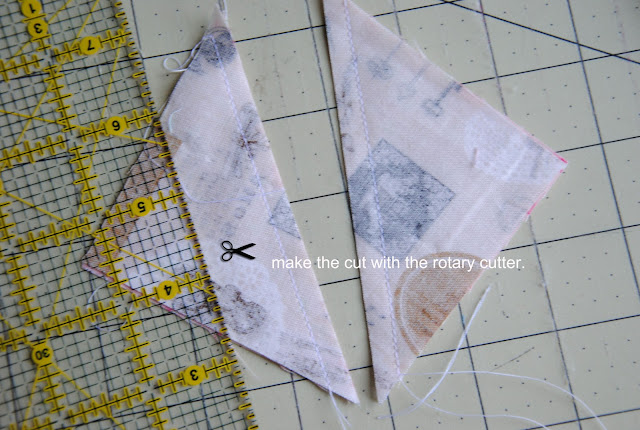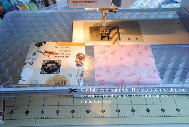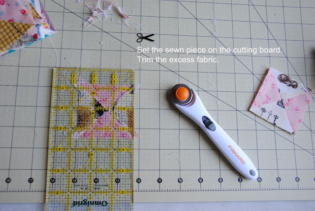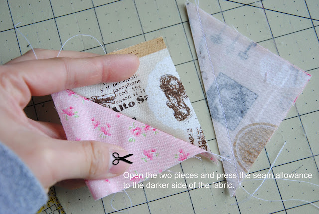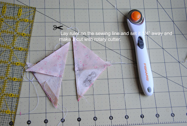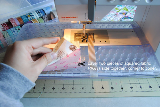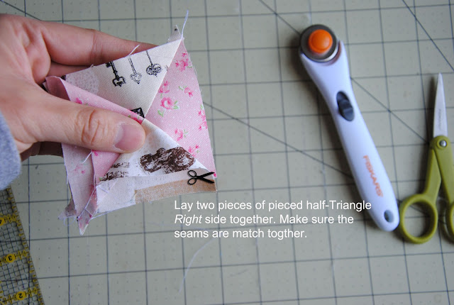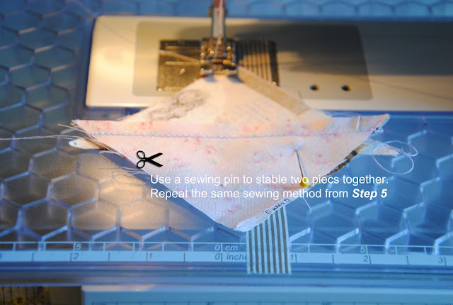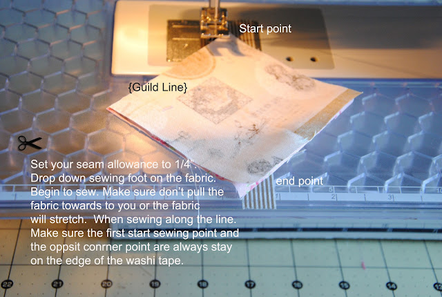 Here is the tutorial to make { hourglass blocks without marking the fabric}. It is very accurate if you tape the washi tape/ masking tape straight and have the sewing machine set in 1/4" for seam allowance. This omit the drawing pencil lines on each square set and the process is quicker. I would recommend reduce sewing speed to half of your normal speed and avoid pulling fabric towards to you. Let the sewing machine take the fabric. It is similar method that I made for { double wedding ring quilt} by using washi tape/ masking tape as sewing guild line on the sewing machine.