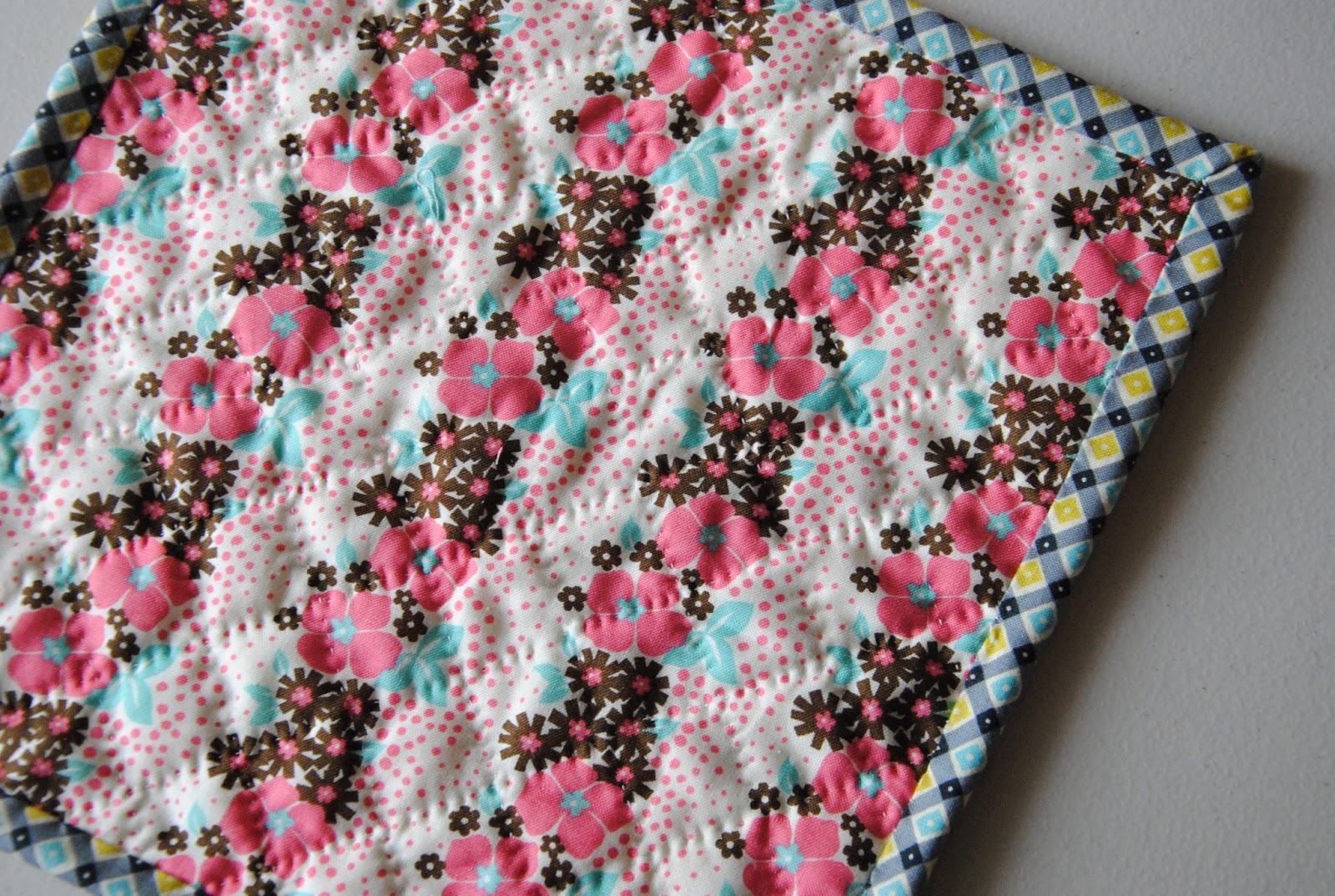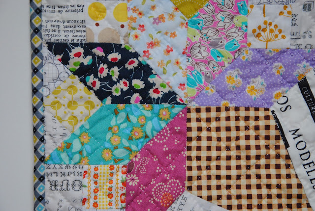 Between spending time with S and finding little personal sewing time. I have finished this mini quilt: bridal bouquet a few days back. It is done by the English Paper Piecing {EPP} method. I decided to make a small version of it since making small projects are much comfortable in the time that I have now. The mini quilt is hand-quilted on 100% warm and natural batting { I brought about a full size in the suitcase with}. The quilt always gets soften after the hand-quilting. The hands wore the batting fiber out and make the quilt soft and fluffy. The colors are really vibrate and have nice contrast between the low volume prints. Hand-bound with DS print. This mini quilt is placed in the {shop}.