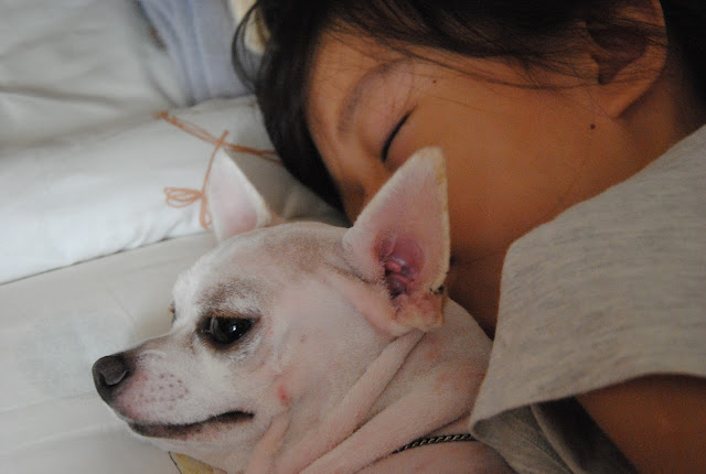 Can you tell, my two antsy fellows have been busy? We took Lucky in for a big haircut and found out the hot/ humid weather cause some skin issue. He is taking medicine now, so the problem seems going away slowly. We wrapped the med. in the toast and covered some sweet jam for him.