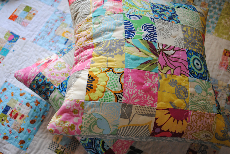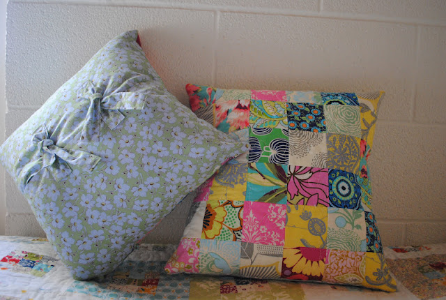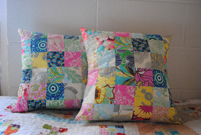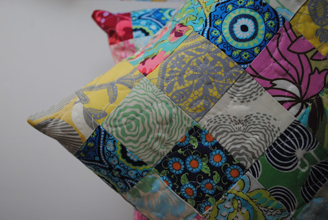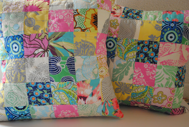Finally finally these patchwork pillows are done!! It took longer time than I anticipated! I used the scraps from {J's quilt} and patched each pieces as I go. Each piece is cut in 3"x3" wide. The pillow size is 16"x16".  This is actually my first attempt making pillows.  They turn out sweet! Of course, a little voice arose on my side and asked, is that for me?  I smiled!   S asked if she can make a pillow herself.  Of course, I responded to her.