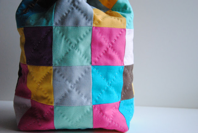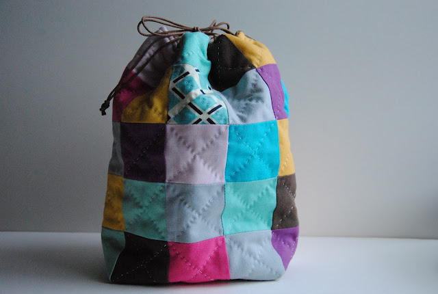 Last week, I finished hand-quilting the new {kin-cha-ku} aka drawstring bag, but didn't manage to finish up, so I stayed up last night and finished up the assembling process.  It is going to give away to my friend. She has been a great supportive friend to us. Over this year, we have been swapping cookies and exchanged canned food. Oh, yes.. she is the friend who has the cat, Shoney.  I hope she will like it!