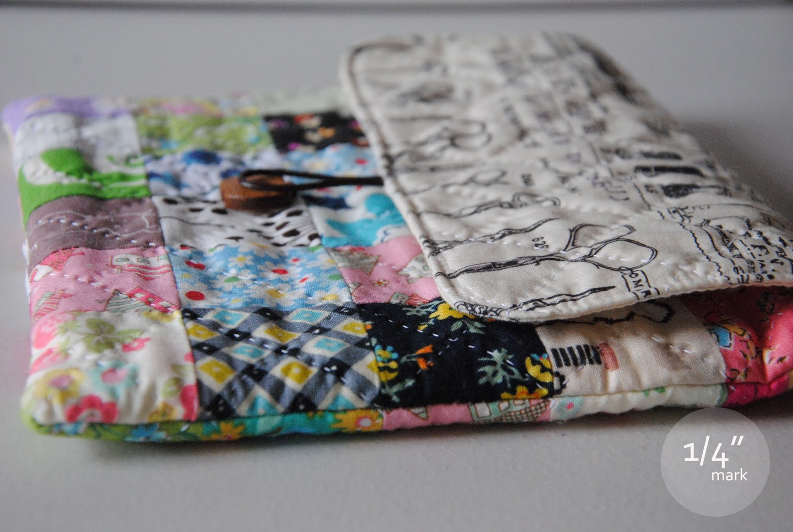Hope you enjoy your way down here and I would love to see if you make your personal mini ipad pouch.. or just a special patchwork pouch is done! As you noted, that I changed the elastic to leather core during the process. I thought I'd give a different style look. This tutorial took a very long time to write. I went a bit fancy to create a little watermark for each photo and it took longer than then I though. While S is in school I was able to focus on the words and hope it all make sense to you. If you ever make one please join us at {made with 1/4" mark Flickr group}.