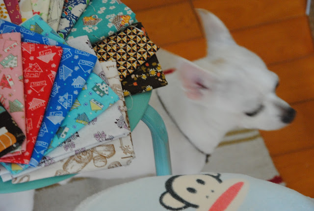 Another fabric pull for a new project. I started over the weekending and it is almost done and hope soon to show and tell. It is always fun to pull out fabric boxes even I have limited prints here with me. { sometimes, I hear my fabrics are calling my name over thousand miles away, but I know my dear friend is taking great care of them for me}. Lucky has been missing S being home! He is bored with me! He spends little time in the room with me and most of the time on the other side of the house. When he walks in, he doesn't do much, then quickly walk out not even a goodbye sniffle. Every afternoon he waits the the sound of keys and he knew it is time to pick up S. At that time, I am his best friend again.