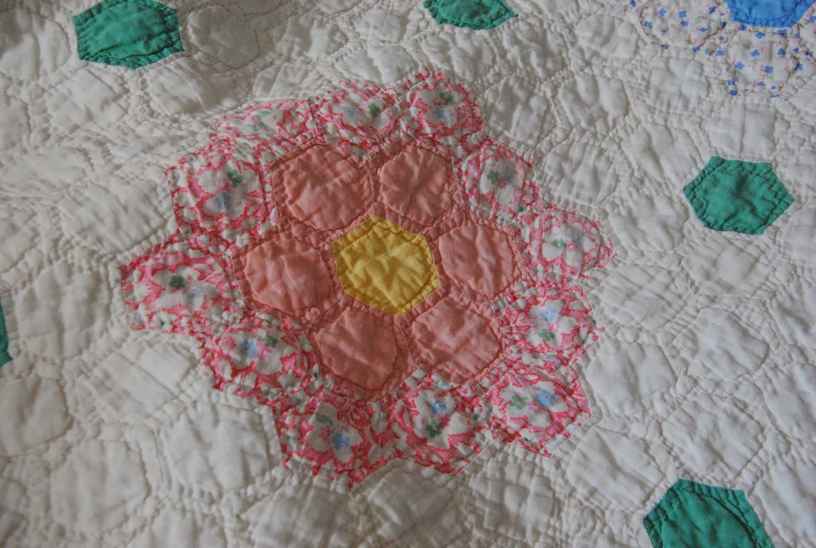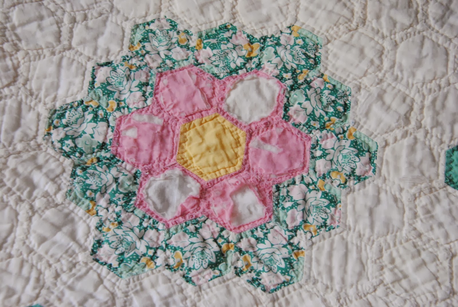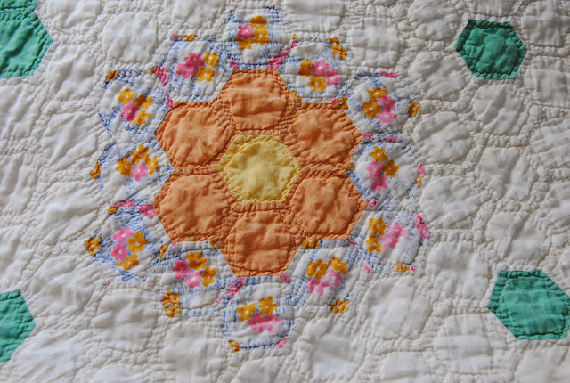 It is a very nice full sized quilt and I pictured it will be in the future sewing room's couch where I could enjoy some tea time and cuddle under it.  What I love about this quilt is the maker is so brilliant! She/ He used fuzzy cuts for each flower pattern. Even some of the hexagons are gone, but I could still see from some of the fade area and traced back the original design.