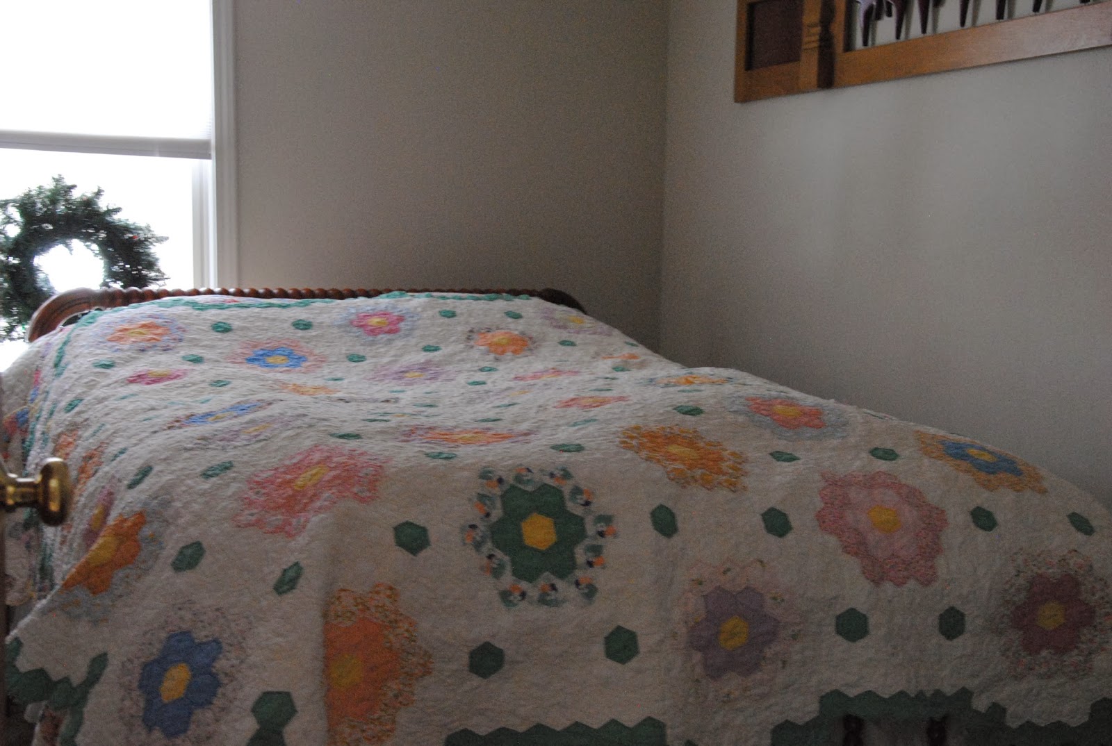The second quilt is made with thousands of hexagons. It is hand-pieces and hand-quilted. There are some worn on the hexagon pieces, but I went ahead and take her home with me on the second trip that I went with S. She wanted some chocolate and gummy for holiday treats.