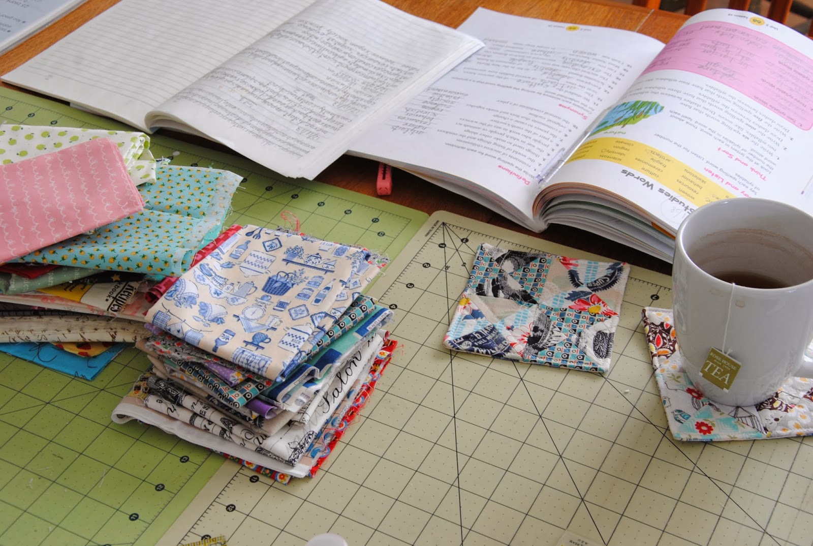 S picked up her prints for her coaster and requested it in half triangle cuts. Hers is with small prints on and almost pastel colors to me. She is devouring her books since they got unpacked! She eats gummies as she enjoys her books! That's the kinda of lifestyle runs at {1/4" mark} home; a sewing mama and a reading S.  S is finding her ways in the new school and making new friends as well. Cross my fingers for the next semester will be fun and enjoyable for her.